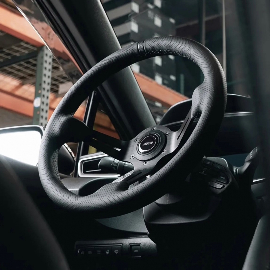 直径350mmのしっかりとしたサイズ感は、ドライバーに絶妙な操作フィードバックを提供。75mmのディープコーンデザインにより、ステアリング操作の反応性が向上し、ドリフトやタイムアタックといったスポーツ走行でのパフォーマンスを最大限に引き出します。